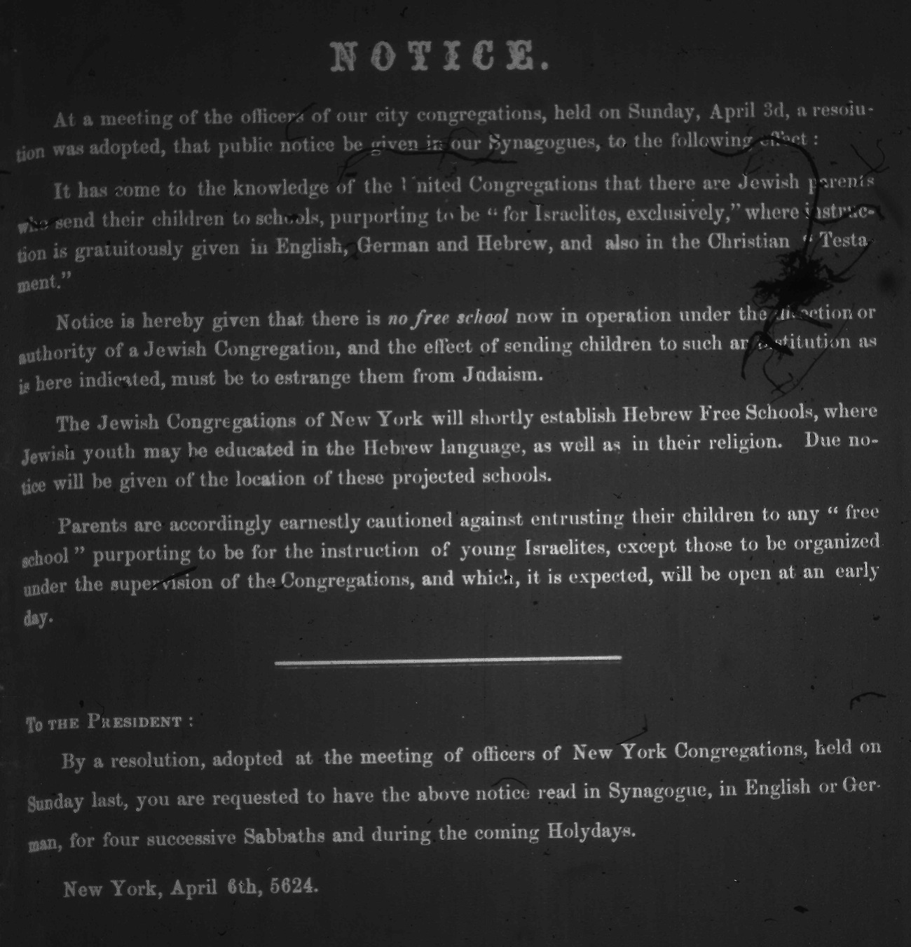 A few months before the Hebrew Free School association came into existence, this notice was circulated to all New York congregations, including Anshi Chesed.
